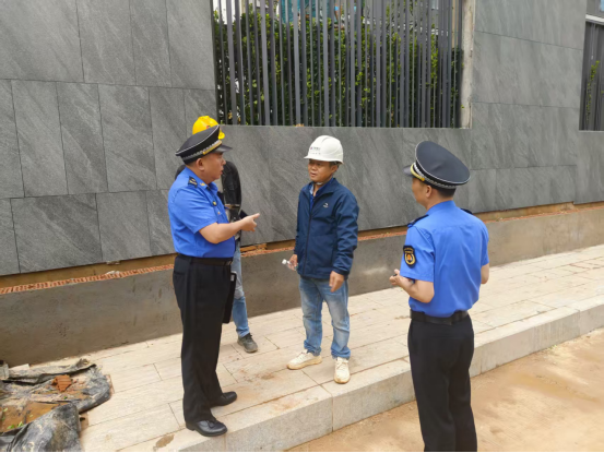 城管中队执法人员和社区工作人员来到辖区一处正在施工的建筑工地现场,与施工人员现场沟通,详细了解施工扬尘防控措施落实情况。检查当中,执法人员认真核查相关施工手续,对场地扬尘治理管控、黄土覆盖、建筑材料围挡等情况逐一检查,并现场记录检查结果,针对存在问题,城管中队给出了建议并下达了整改通知书,责令企业限期整改到位。